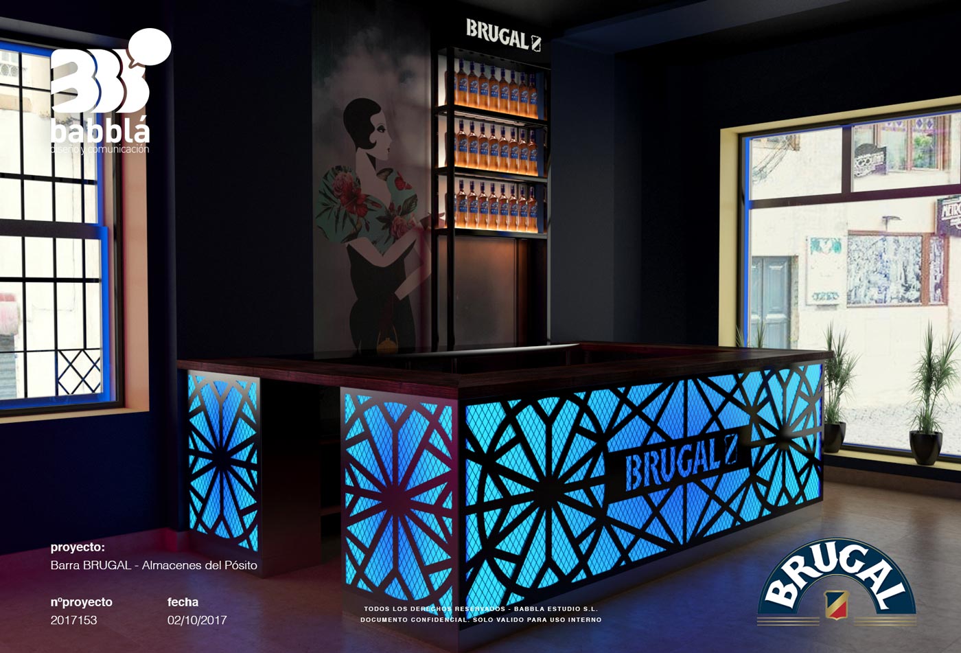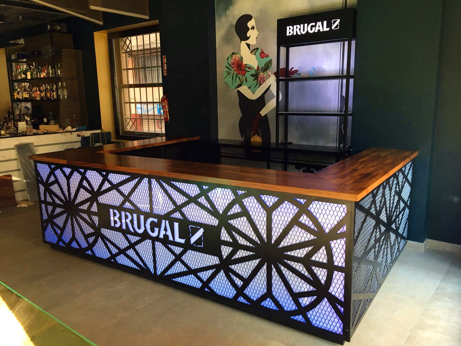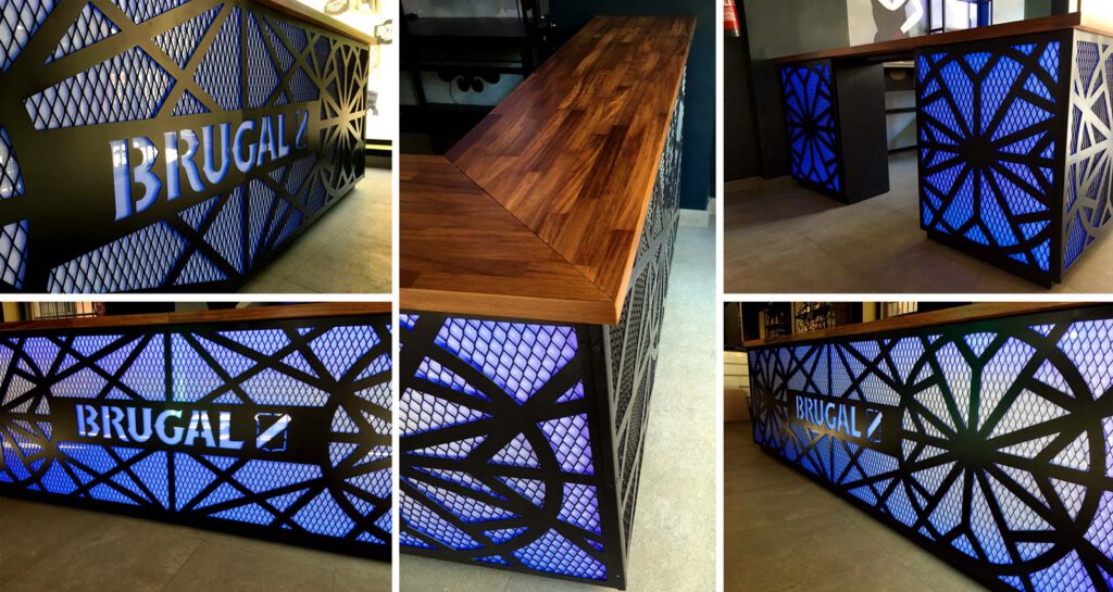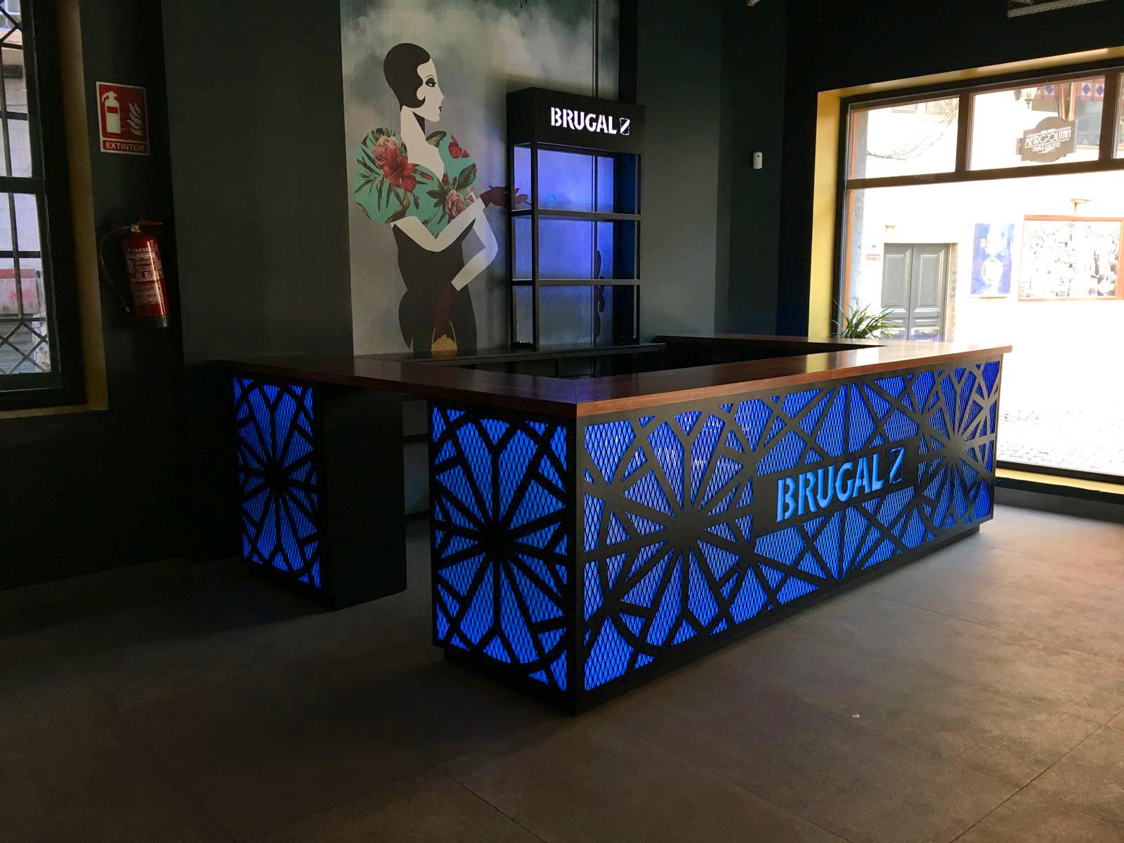 El cliente nos encargó realizar una barra secundaría debido al incremento de público que tienen cada noche. Brugal fue la marca que el cliente negoció para la implementación en este espacio, y fue todo un reto, porque tuvimos que realizar una acción que se integrara totalmente con la esencia del espacio. Que destacara, pero que fuera un elemento acorde a la fantástica decoración del espacio. Un reto que aceptamos por supuesto.