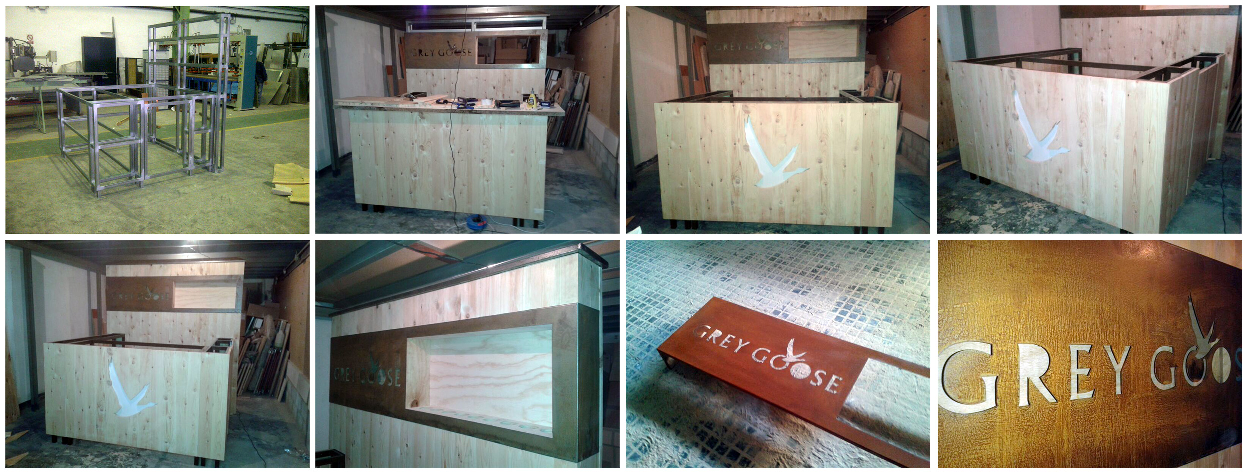 Fabricamos una barra modular, sobre estructura de hierro galvanizado y lacado al color del acero corten. El frontal y la trasera se forraron con duelas de madera tratada para exterior y envejecida. Un sobre completo de barra en acero corten, así como un cinturón con el logotipo de GreyGoose cortado para la trasera con el botellero y un zócalo de corten también para todo el perímetro inferior de la barra.