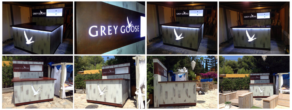 Terminamos la fabricación aportando el detalle del Ganso de GreyGoose retroiluminado en el frontal de la barra, así como el perímetro frontal de la barra, las letras corpóreas de la trasera y el botellero.