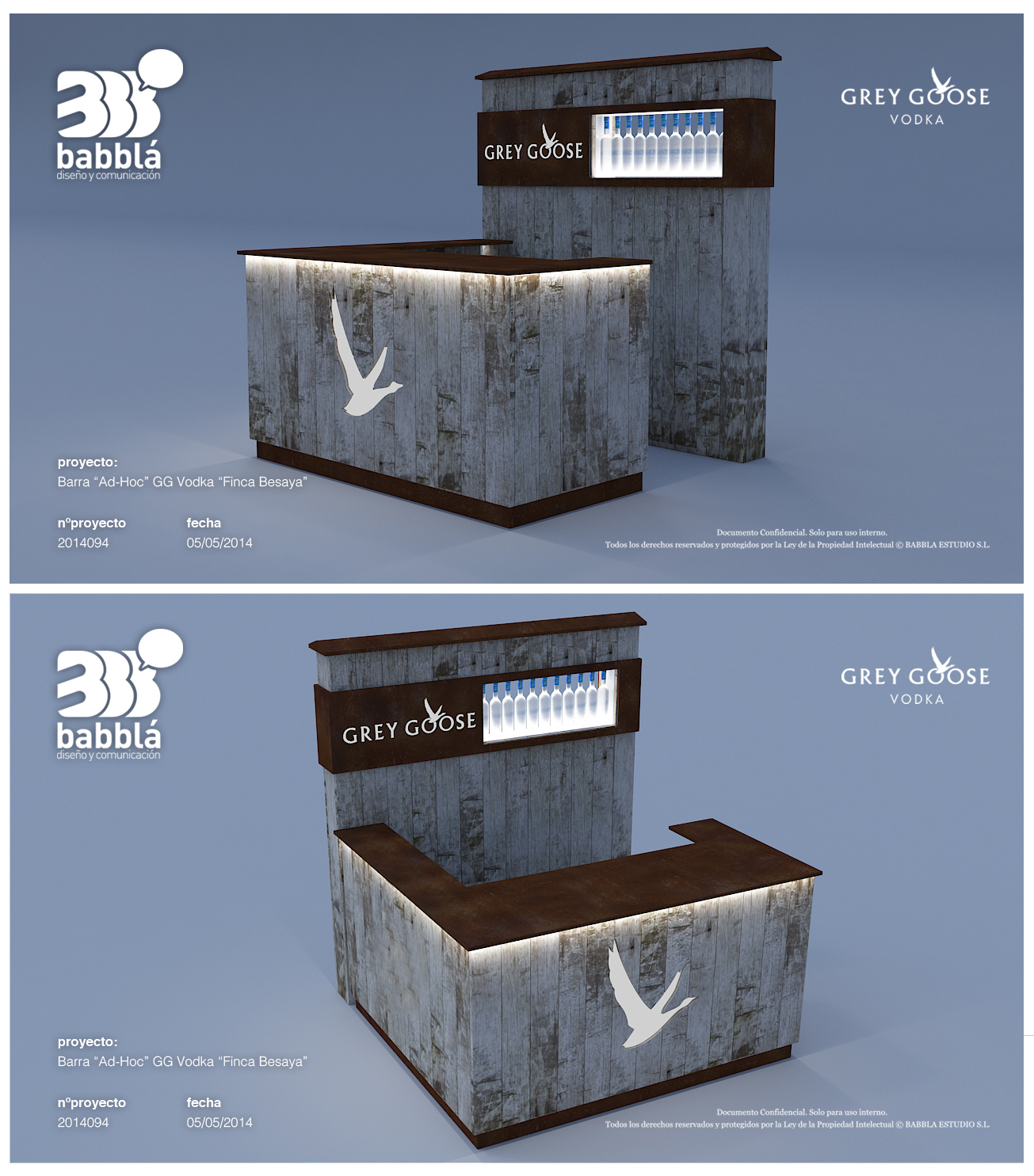 Planteamos a Grey Goose el diseño de una barra de cocktails para el patio de fuera del restaurante, con un lineal de botellas de Grey Goose en la trasera, y donde los materiales principales fueran la madera gastada y el acero corten.