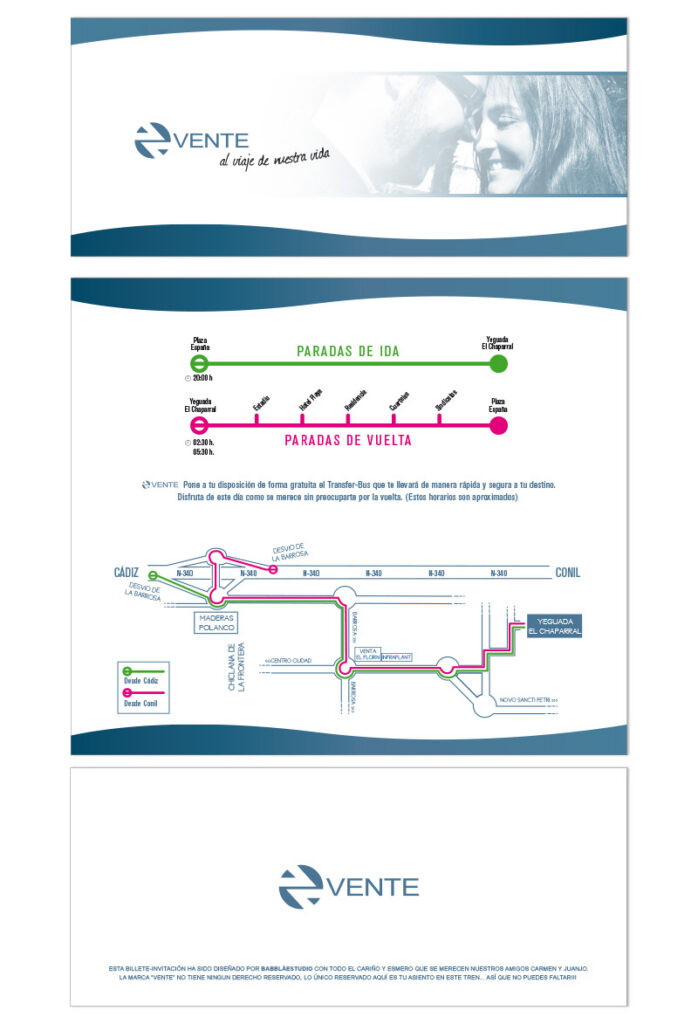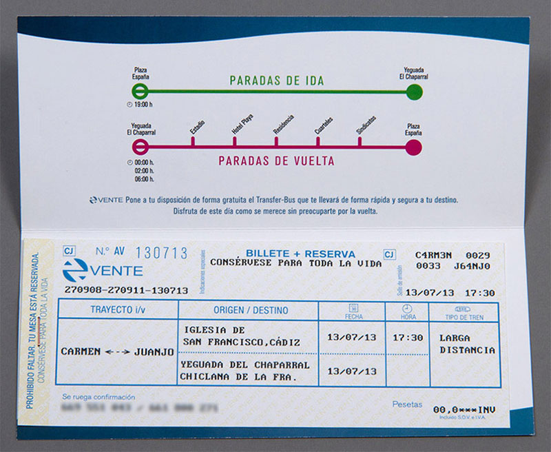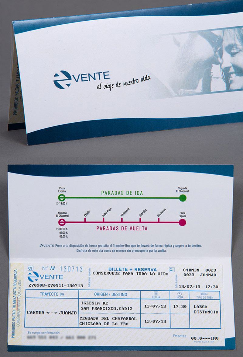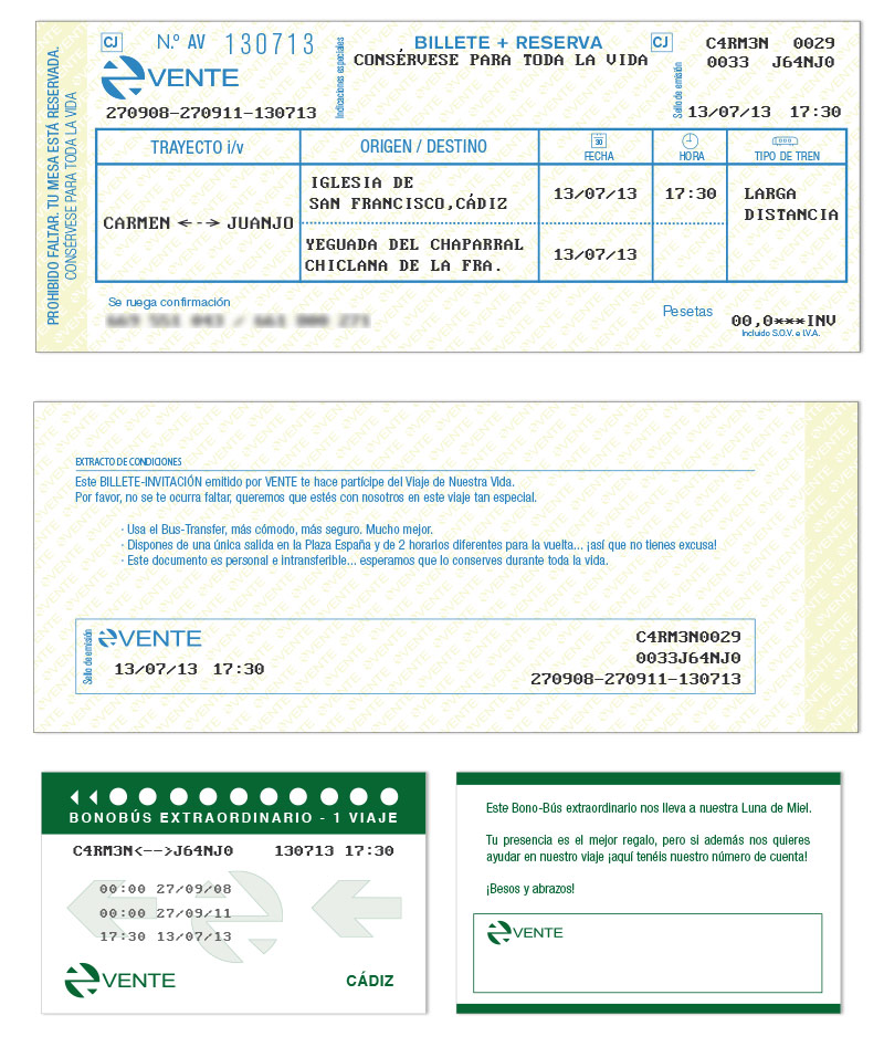 Nos pusimos manos a la obra pensando en desarrollar una creatividad que le viniera como anillo al dedo a esta pareja. Juanjo y Carmen se han pasado todo su noviazgo subiendo y bajando del tren Cádiz-Madrid debido a que cada uno trabajaba en una ciudad.