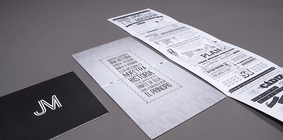 Y es que la historia de Marián y Javi es muy larga, tan larga como fue esta invitación de casi 70 centímetros de alta, impresa es una cartulina mate de 315 gr. en una sola tinta. Había mucho que contar, y así fue.