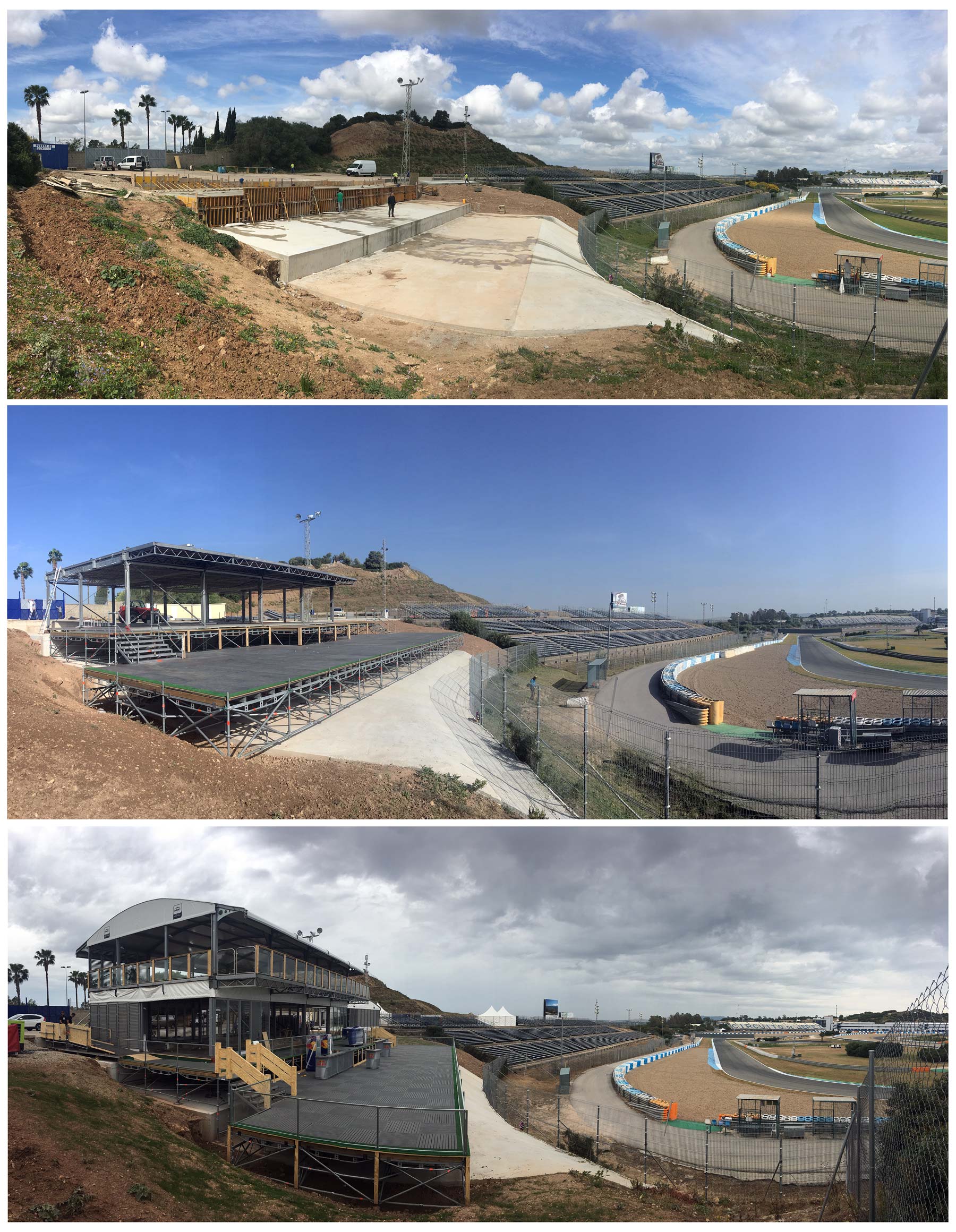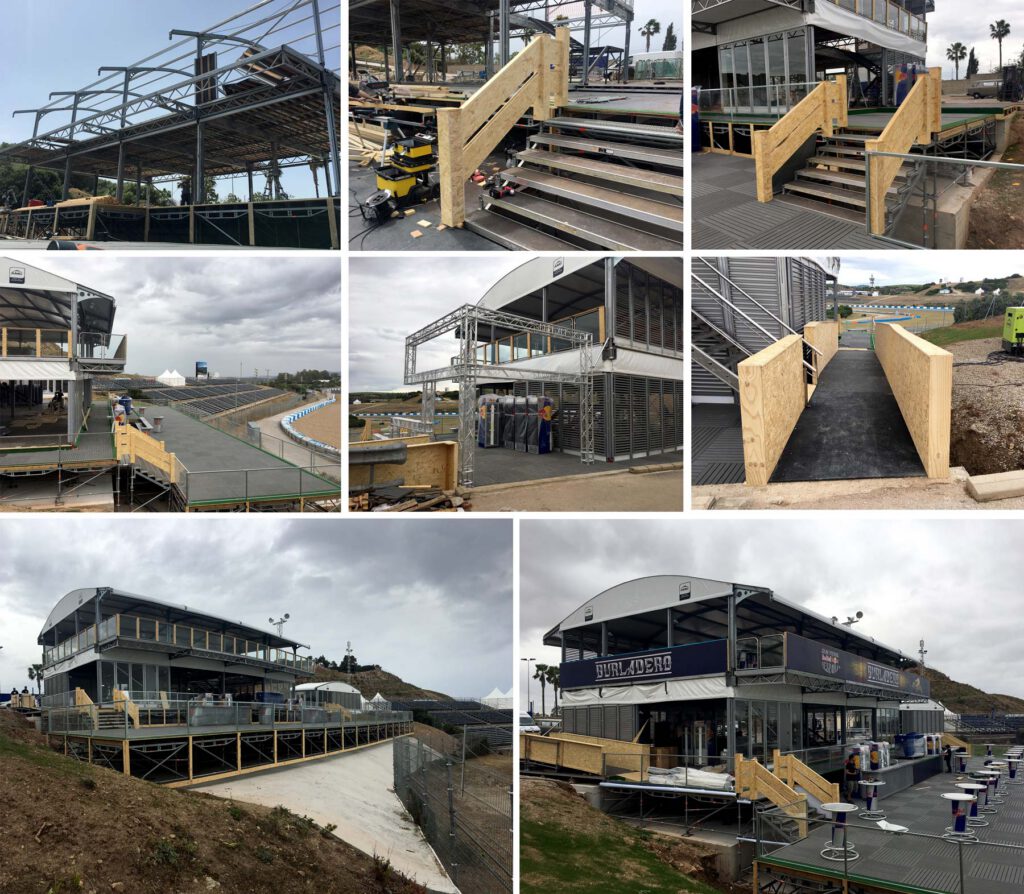 Realizada la cimentación, levantamos una terraza en estructura tubular tipo layher y alquilamos una carpa de 20×10 metros tipo “arco” a dos plantas a nuestro proveedor AMG SERVICES (proveedor oficial de carpas premium para MotoGP), además de una carpa 10×5 para servicios.