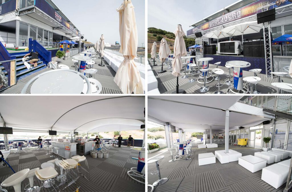 Toda la terraza se forró de madera de teca, barandillas traslúcidas, branding de Red Bull en todo el perímetro, incluido el techo que permitía visualizar el logo de nuestro cliente en las tomas aéreas.
