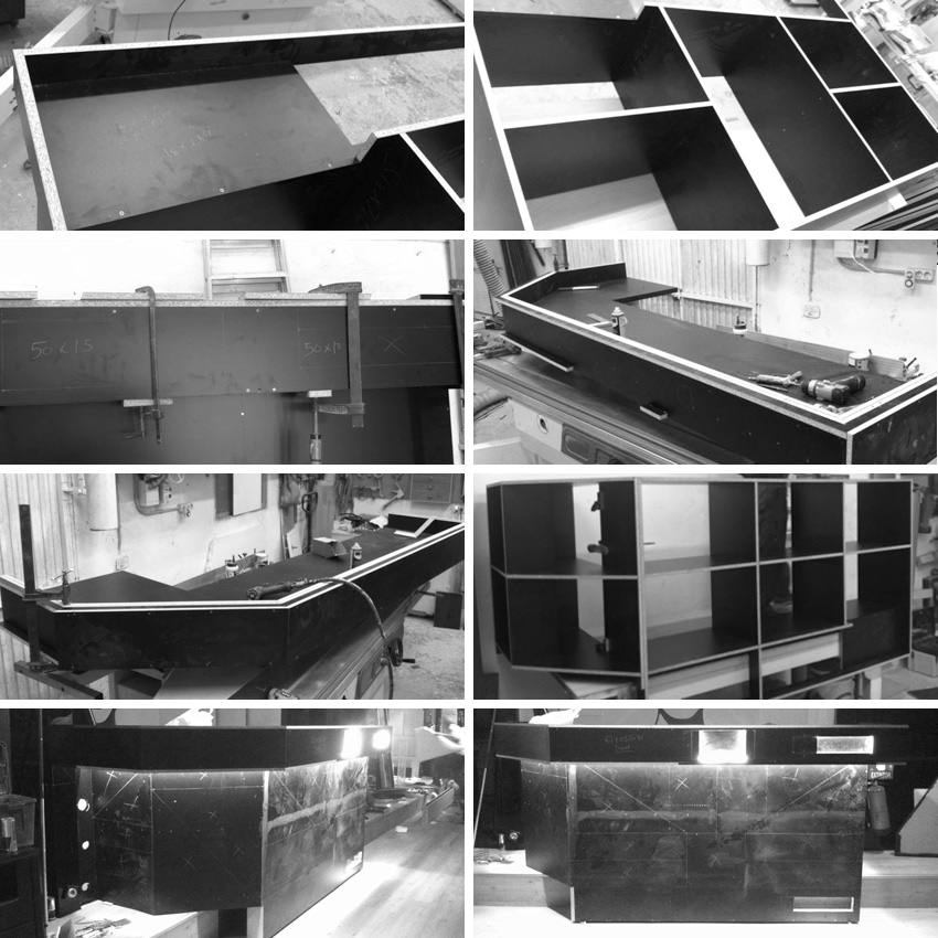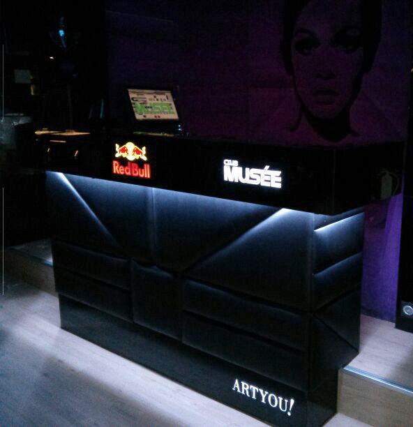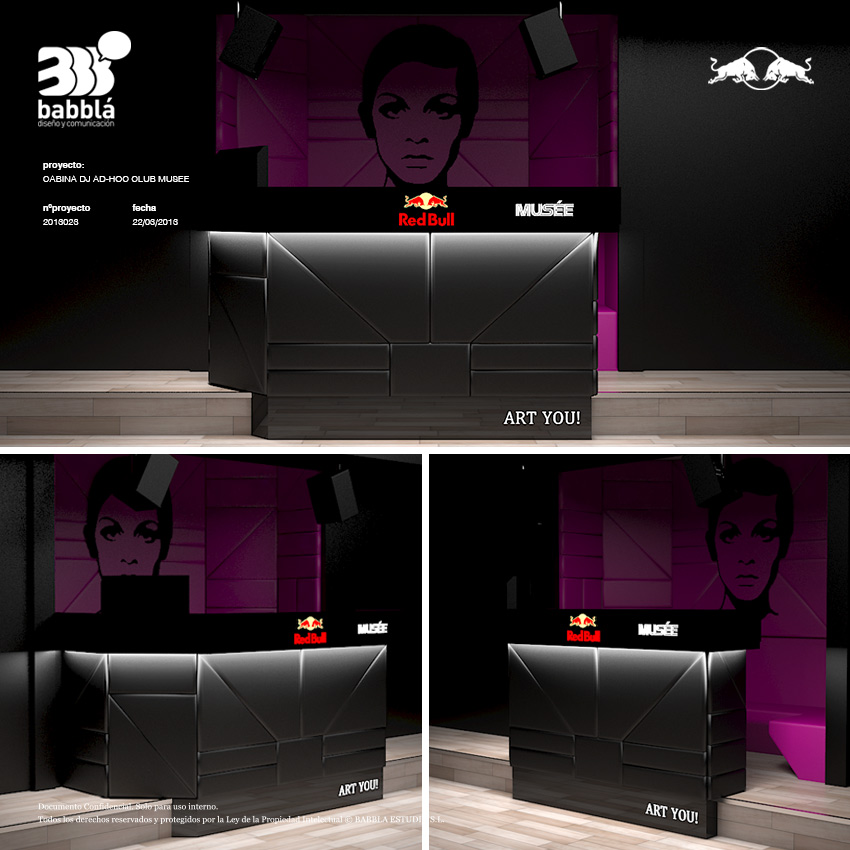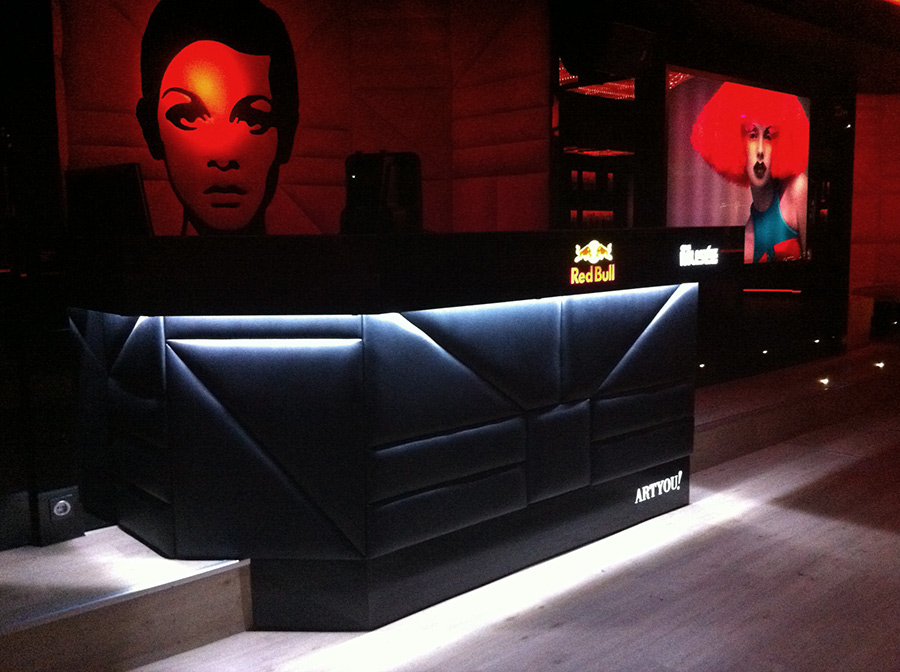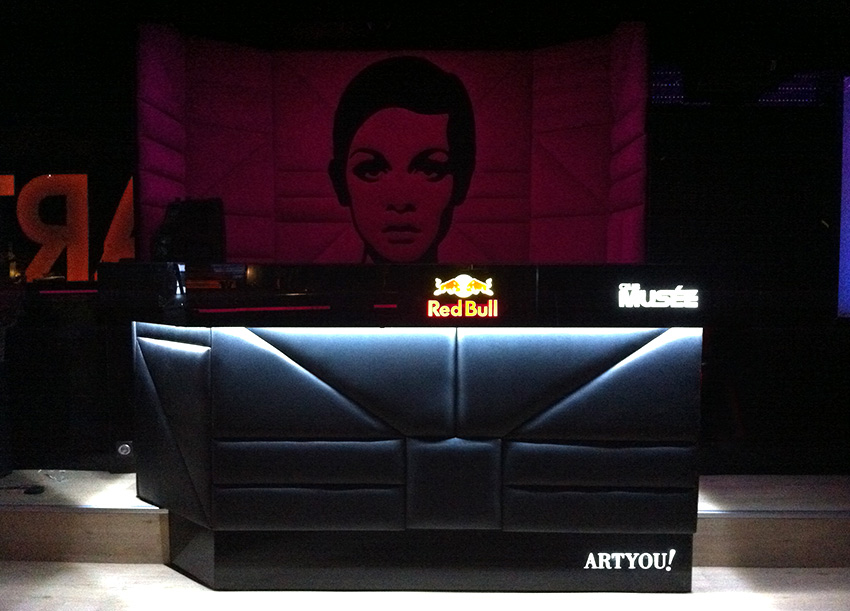 La cabina está fabricada con una estructura principal de madera que en su parte superior lleva un vuelo forrado en cristal negro donde pusimos los logotipos de Red Bull y Club Musee retroiluminados. Todo el frontal y laterales de la cabina están tapizados en polipiel negra acolchada en foam y formando un despiece a modo de puzzle. La parte frontal inferior termina en cristal negro con la denominación “Art You!” también retroiluminada.