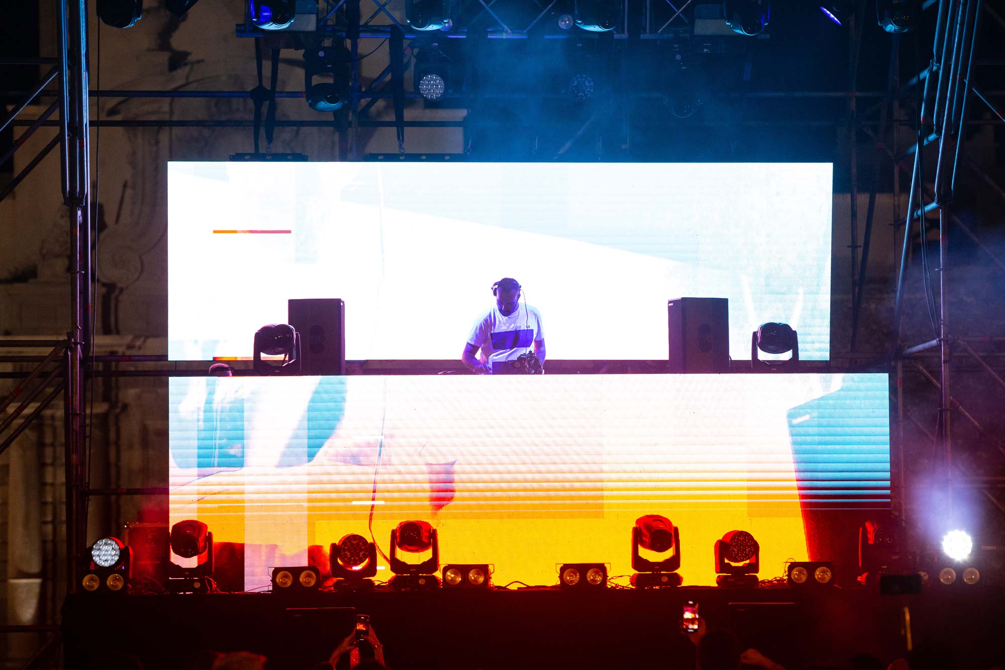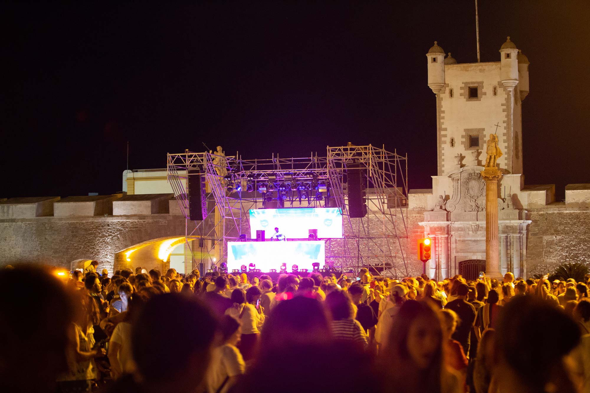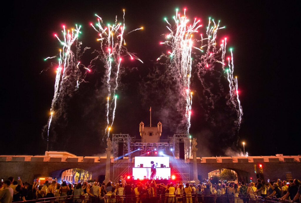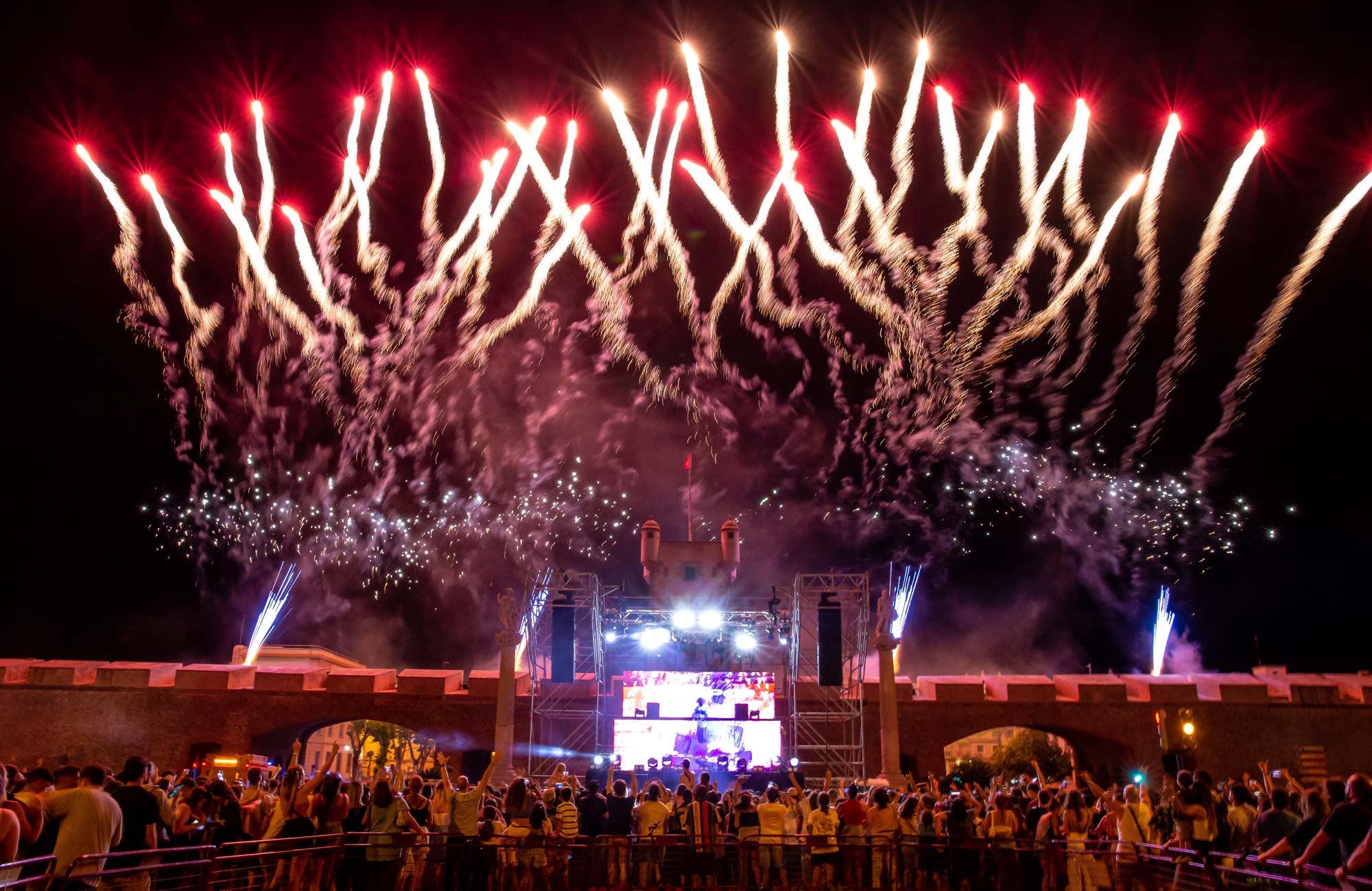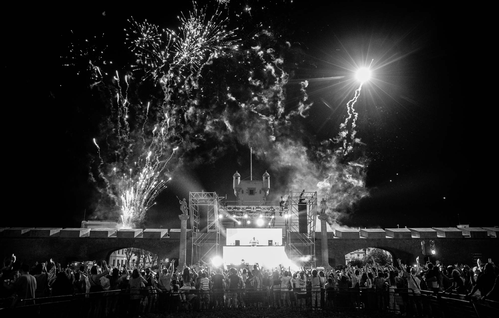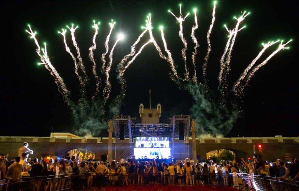 La idea era “sencilla” a la par que atrevida: Montar un escenario delante de las Puertas de Tierra, cortando la avenida principal de la ciudad, y sincroniza una sesión suya con un espectáculo de fuegos artificiales que fuera el “Closing Party” nunca visto en la ciudad.