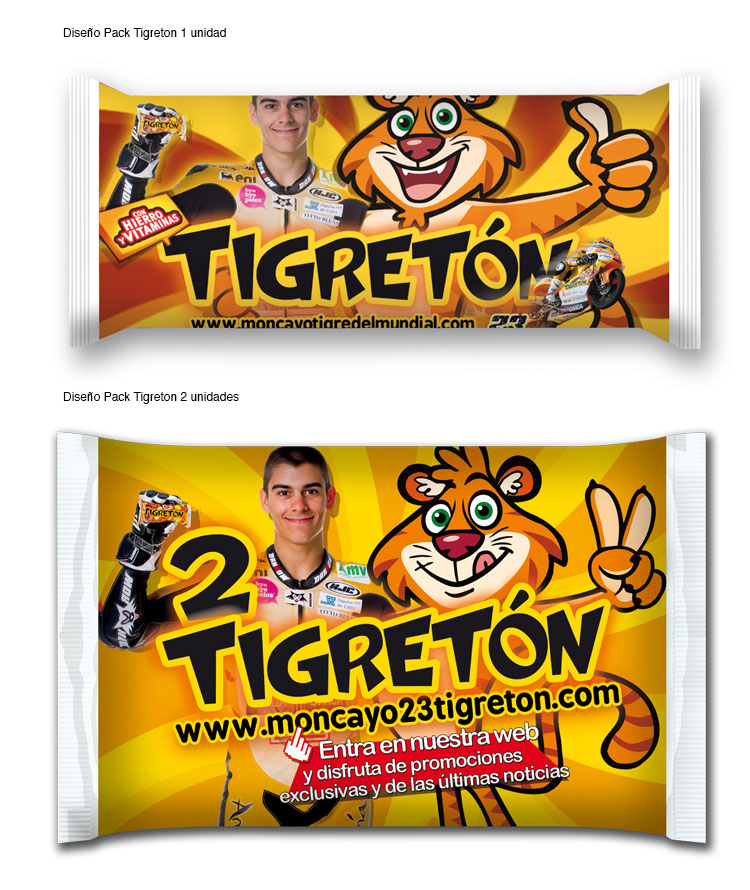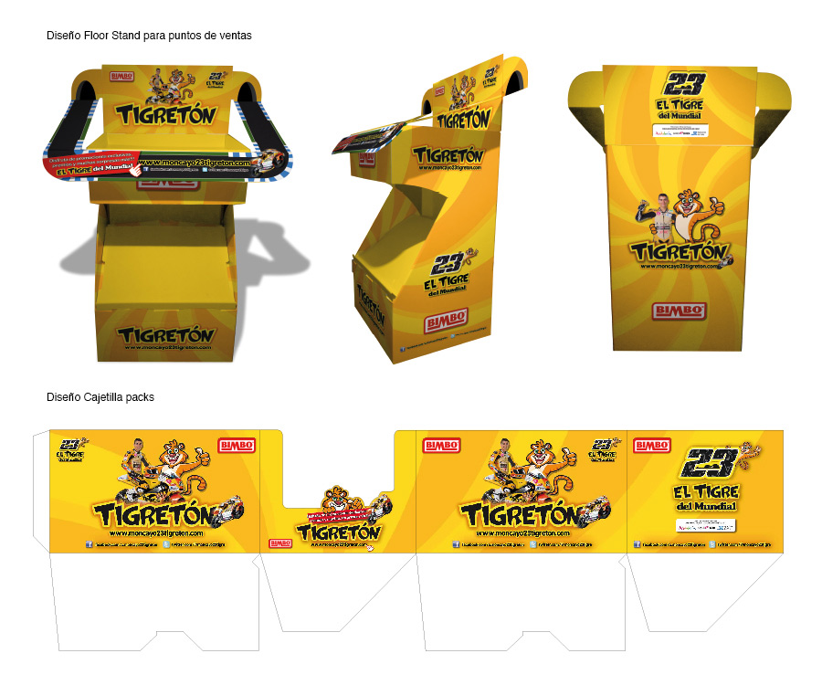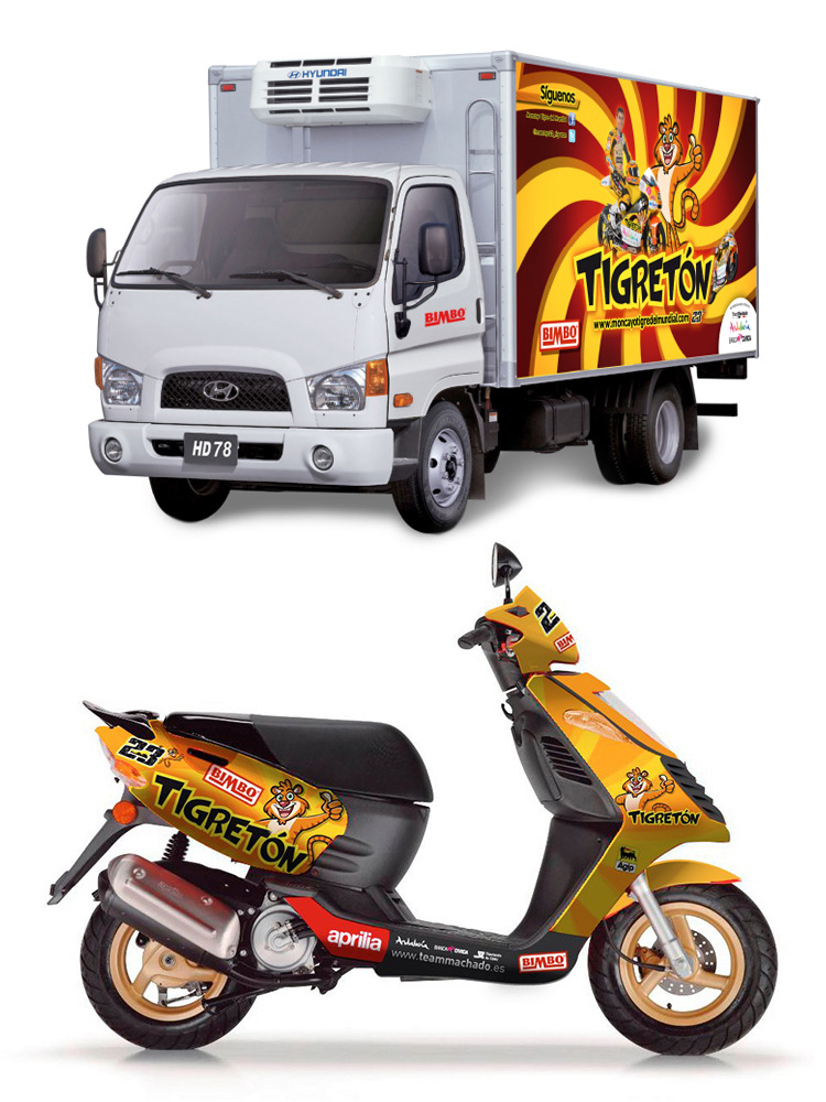 Diseñamos la moto, el casco y el mono del piloto, los camiones de Bimbo rotulados con “El Tigre del Mundial”, los uniformes de las azafatas, la moto del Service Road del equipo, el Packaging del Tigretón, las cajetillas de los pasteles, el «floor-stand» para los puntos de venta y todas las activaciones que la marca desarrolló en los circuitos de toda España acompañando a su “Tigre”.