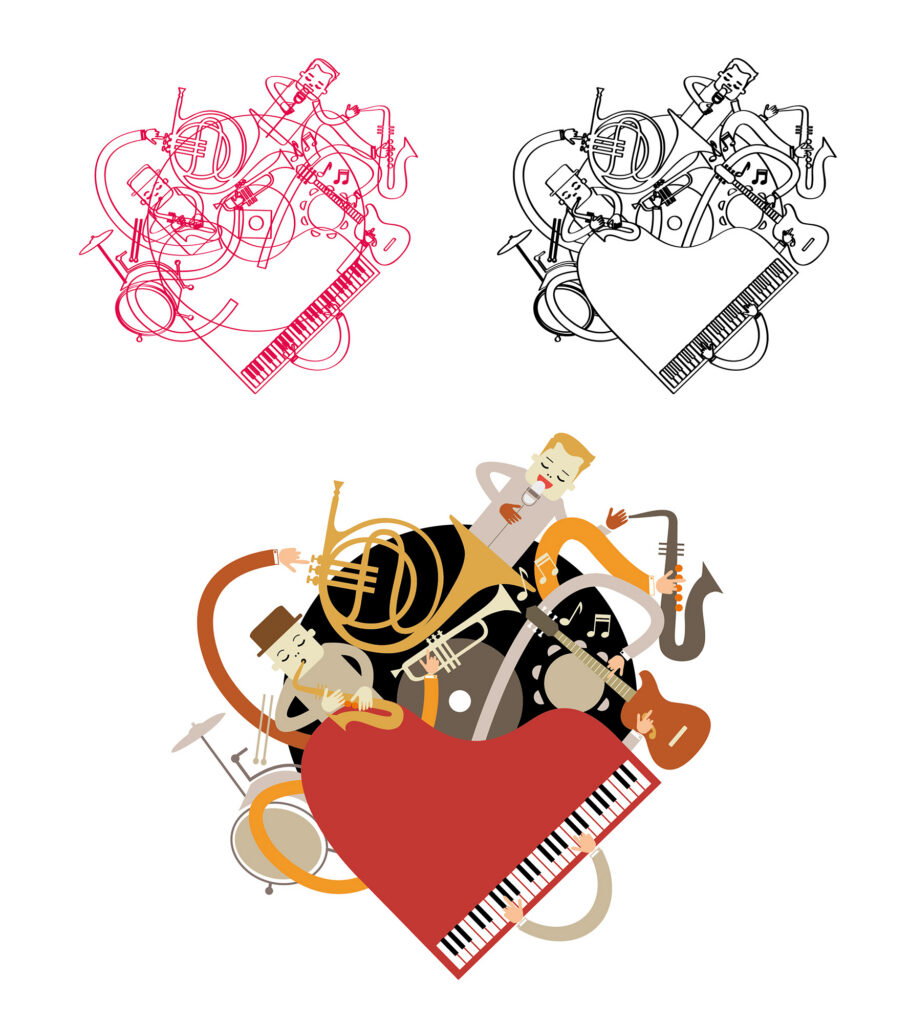 Ésta vez, apostamos por una imagen central ilustrada, algo “caótica” en la que se muestra lo que sería la visión de un músico de Jazz, compaginada con la limpieza en un cartel, que no lo hace pesado, que a su vez hace destacar más aún si cabe la misma.