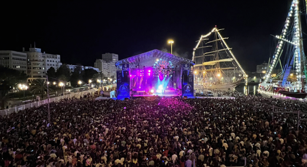 El Muelle se engalanó para dar la bienvenida a las 15 embarcaciones que venían de La Regata de Grandes Veleros Magallanes-Elcano, con una serie de actividades para todos los públicos, así como conciertos, carnaval, una noria gigante o un espectáculo de drones…