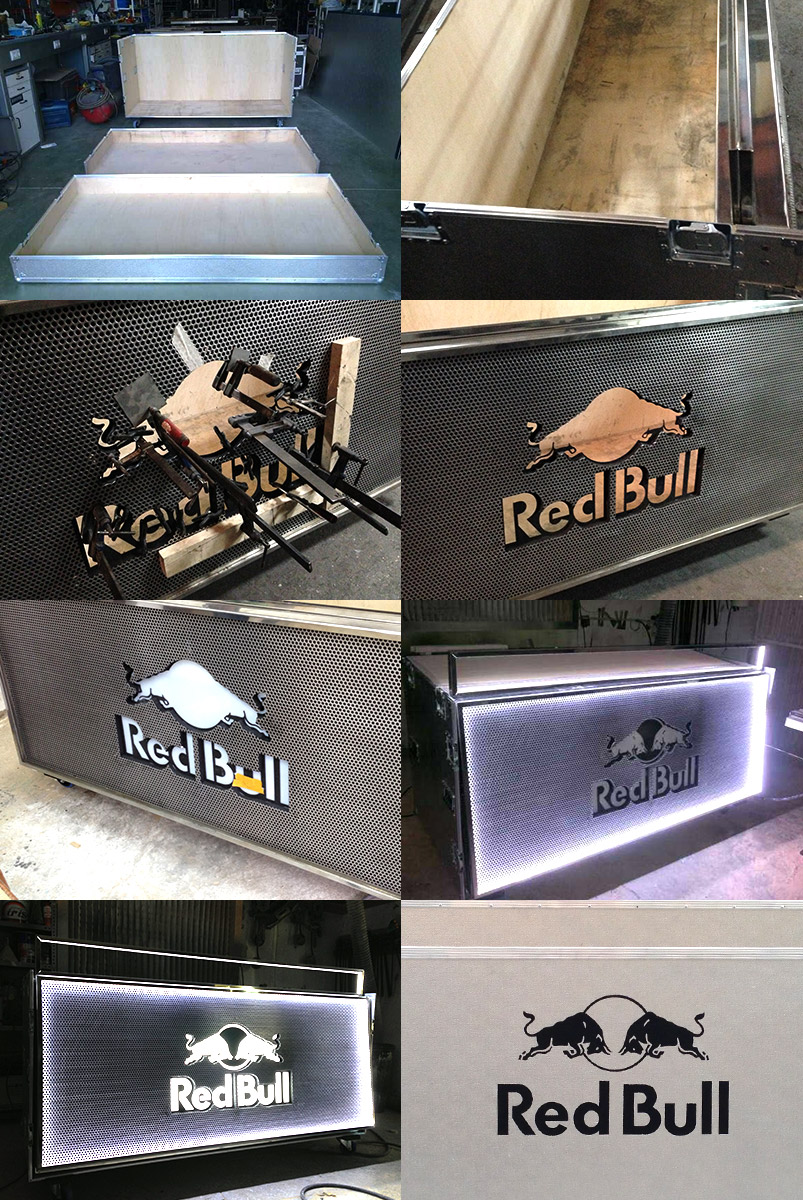 El resultado, una mesa con instalación eléctrica propia, logo retroiluminado y fácil de transportar.