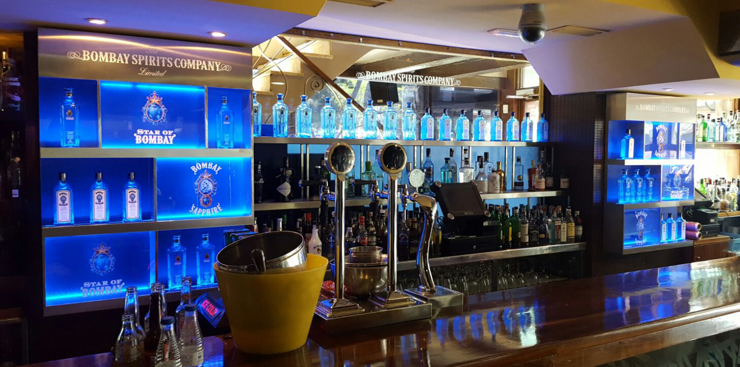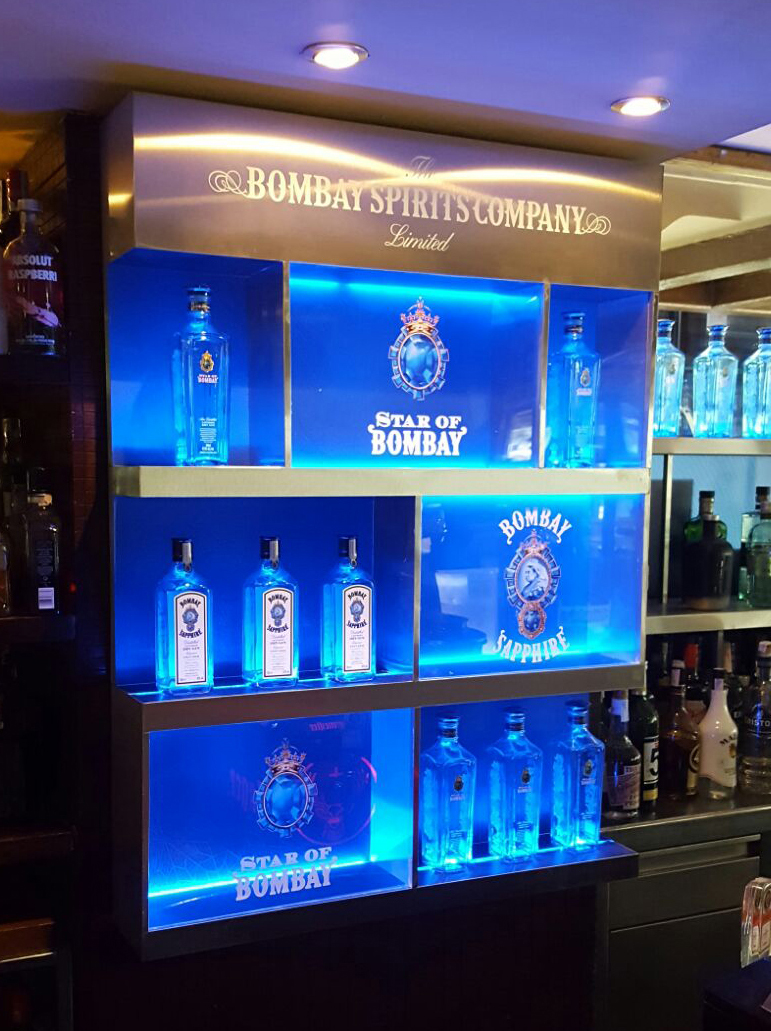 Para la sala Bling Bling diseñamos unas mesas retroiluminadas que mostraban en el sobre una botella del vodka GreyGoose así como desarrollamos un botellero en acero inoxidable. Por otro lado, en Tropical diseñamos una contrabarra para promocionar la ginebra Bombay Shappire por medio de un botellero central y 2 botelleros laterales con iluminación led y todos ellos realizados en acero inoxidable.