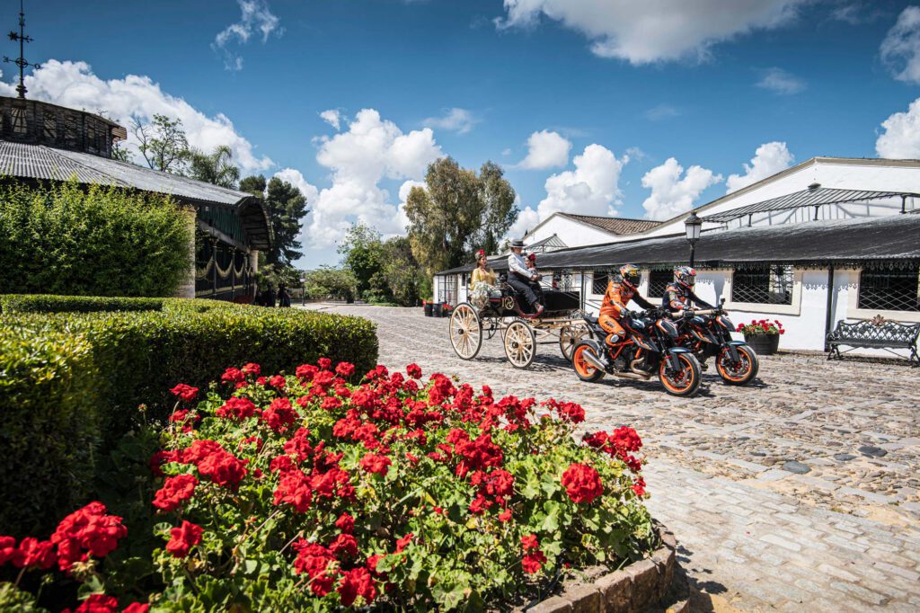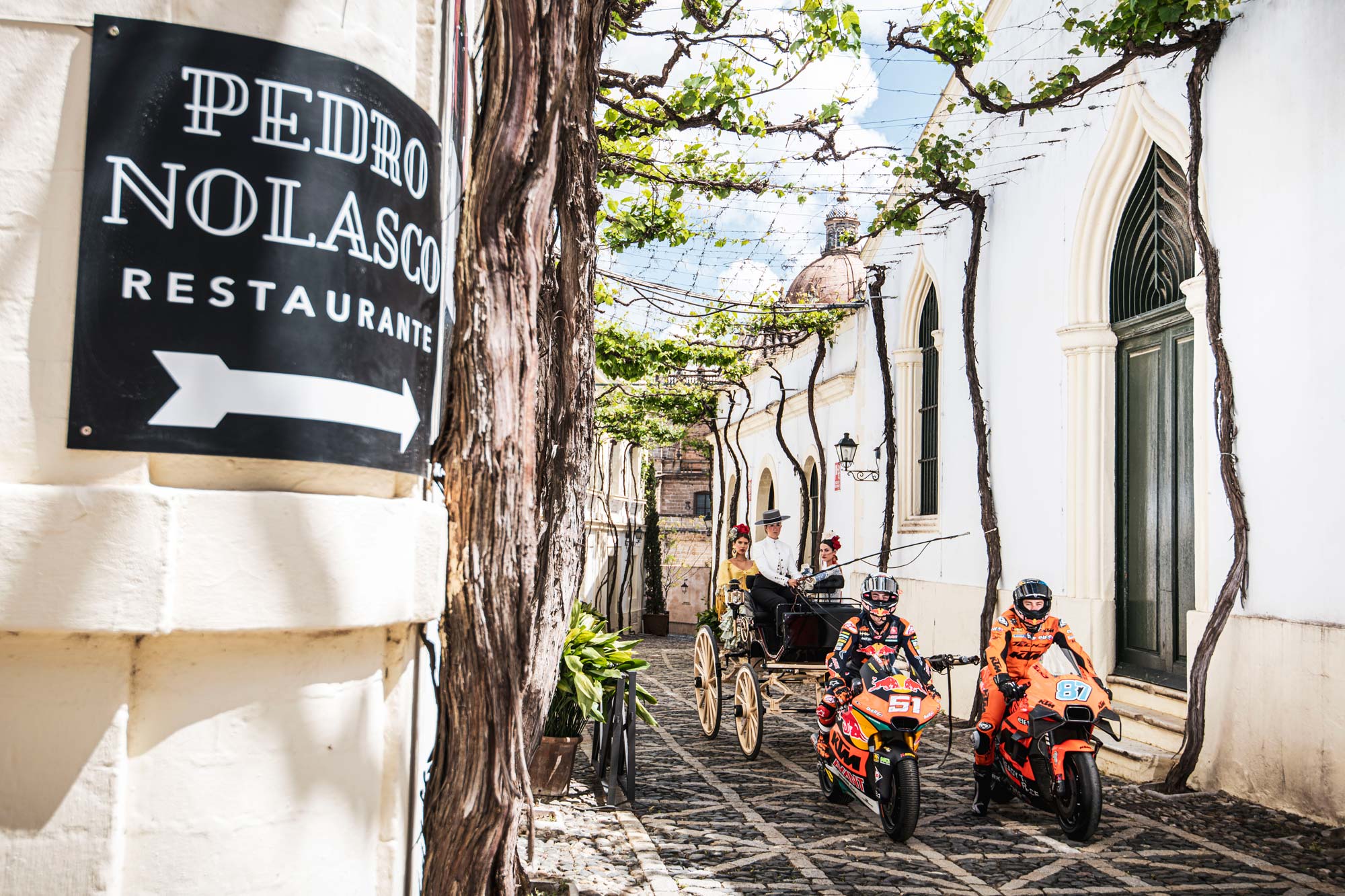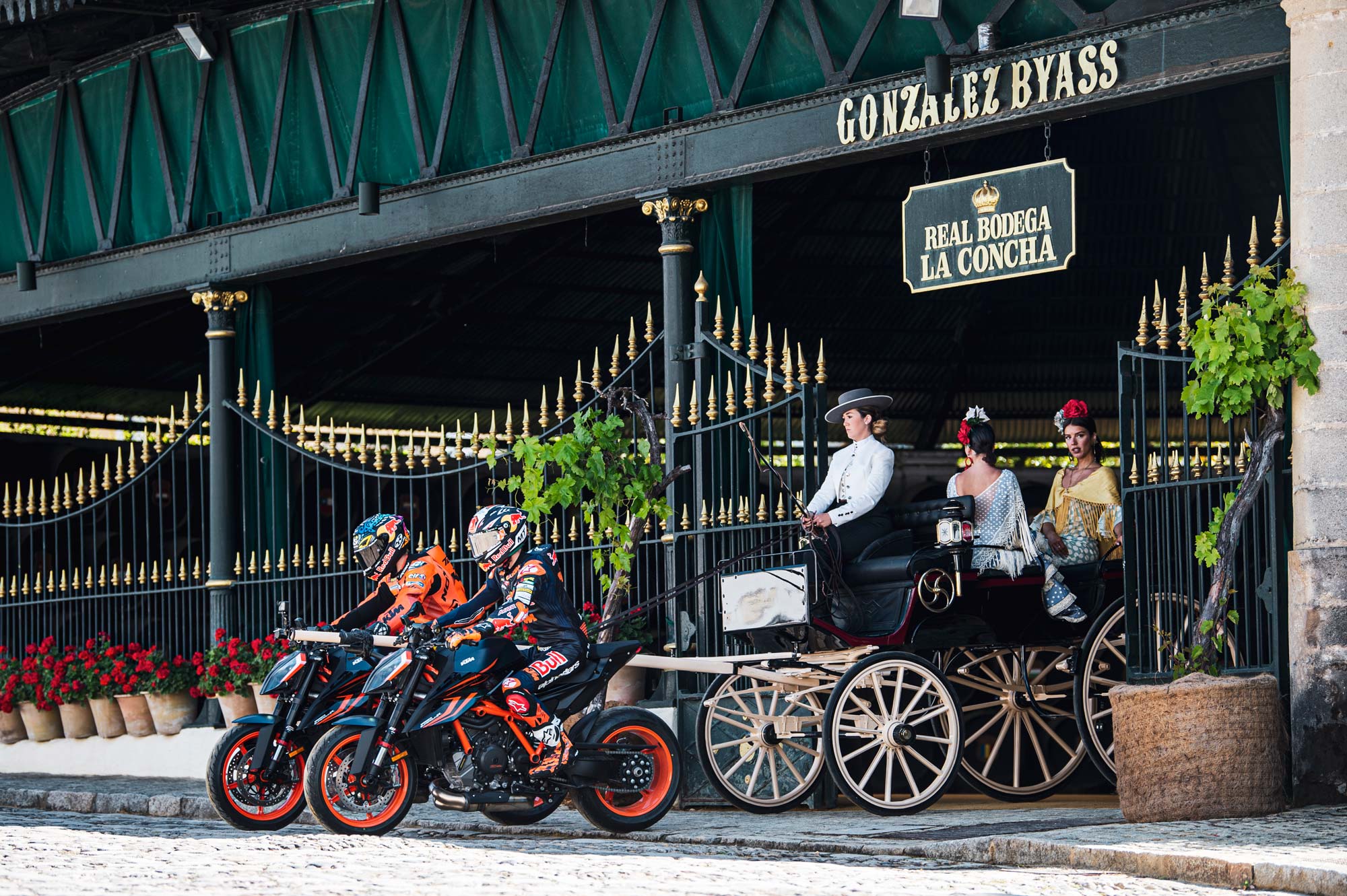 Para esto, nos alineamos con las bodegas González Byass, enclave único en la ciudad de Jerez, de interés Internacional y que dispone de unas instalaciones en pleno corazón de la ciudad que son una obra de arte viva. Pero claro, era imposible poner tantos caballos… si no fuera poniendo dos KTM SuperDuke con 180 caballos de potencia cada una, tirando de la Calesa. Para ello, tuvimos que fabricar un soporte adhoc, que soportara el tirón que las motos darían, y el empuje de la propia calesa con la inercia. Además, por supuesto, de contar con dos pilotos super experimentados de la estructura KTM RACING que participarían en el Mundial días después: Pedro Acosta y Remy Gardner.